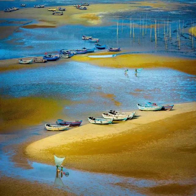 这是傍晚逆光顺光拍摄港湾的好位置。每当潮水退去,海滩上就会残留些许海水,映射着天光。海潮也许是大自然最精美的画师,她笔法流畅,挥洒自如,小皓就是她的杰作,即便是没有彩霞的映照,海滩也同样会呈现出迷人的画卷:退潮犹如水银泻地,曾经飘荡的小船已然沉寂,层层波浪轻柔地拍打着海滩,绵绵不绝,为画面增添韵律感。