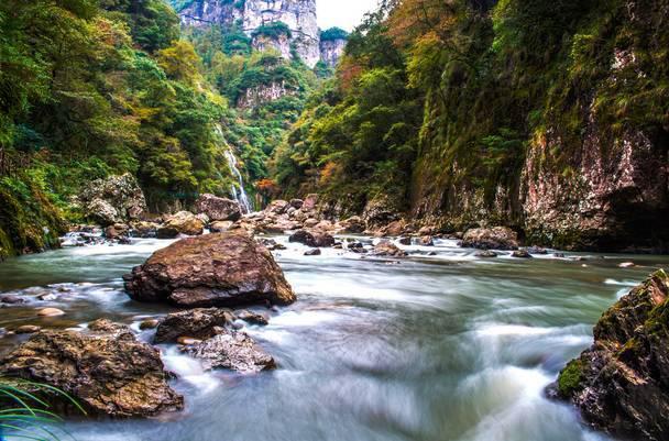 鸳鸯溪大峡谷是世界地质公园,国家重点风景名胜区,5A级景区。集溪、瀑、潭、峰、岩、洞、林于一体,清幽险峻,气势磅礴的峡谷溪流景观。听溪流潺潺诉说,把一石一岩一潭一滩,湿润得斑斑驳驳。一石一情态,一潭一风光。溪中有万蛇出洞、金蟾望月、水宫龙床、鸳鸯欢第、定溪神柱;山峰上有虎嘴岩、鹰鼻岩、三生石、双月宫,还有一穴穴岩燕暖巢。群蛇、金蟾、河马、猪羊,诸多生灵尽赴鸳鸯娘娘的宴请而至,峡谷间五口大鼎并列排开,煮水化肴,经年不息。半山腰的鹰、虎,一个伸鼻吸气,一个张着大嘴想一口吞宴,但世间万物相互制约,欲望化石,警示着没有独尊。