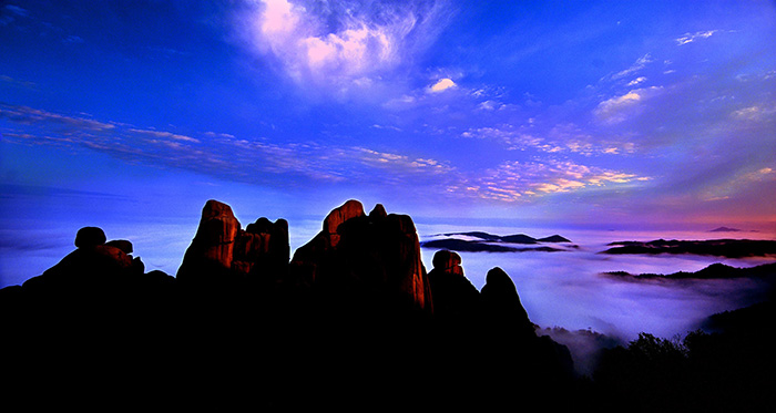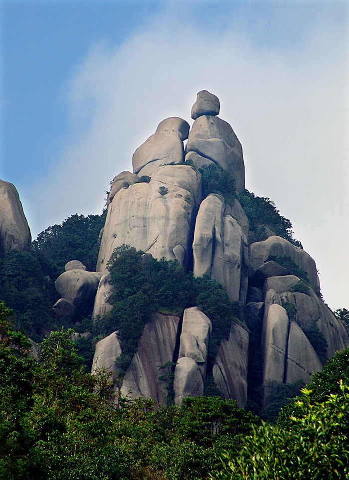 九鲤朝天峰丛由9座挺拔的石峰、石柱组成,颇似九条跃起的鲤鱼,故称“九鲤朝天”,石峰、石柱笔直向上,十分壮观。由于近水平节理发育,峰顶、崖壁被球形风化塑造成各种形态,形成惟妙惟肖的象形石。