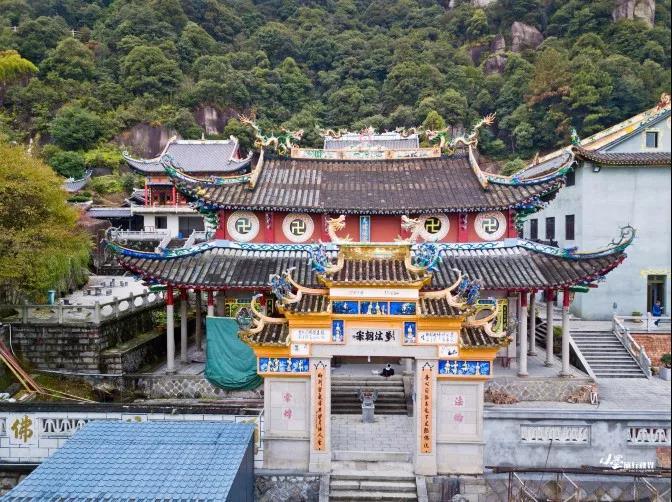 从空中俯瞰,九鲤湖如玉般的湖水镶嵌在太姥山中,美妙无比。在九鲤湖旁边的便是香山寺,香山寺始建于明朝,原名“妙香庵”。大雄宝殿前有块巨石叫“犀牛望月”,牛颈有一天然岩洞叫“犀牛洞”,洞壁上有一联:“秀句满江国,芳声腾海隅”,乃清户部尚书,同治、光绪皇帝的老师翁同龢所题,旧时佛堂就建在犀牛洞内。香山寺周围的山谷盛产兰花,花开时节,幽香阵阵,故寺名叫“香山寺”。