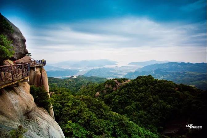 太姥山位于福建省东北部,在福鼎市正南距市区四十五公里附近。其挺立于东海之滨,三面临海,一面背山。主峰海拔917.3米。它北望雁荡山,西眺武夷山,三者成鼎足之势。相传尧时老母种兰于山中,逢道士而羽化仙去,故名"太母",后又改称"太姥"。闽人称"太姥"、武夷为"双绝",浙人视"太姥"、雁荡为"昆仲"。山峰一般集中在500~1000米高度之间,峦岭交错,谷深壁陡,洞穴遍布,云雾缭绕。山上多奇花异树,如空谷兰、云雾草、感触树、相思林、五色杜鹃、绿雪芽茶等,更为山景增色不少。而东望大海,蓝天与碧海共妍,岛礁同港湾并美,使人更深刻地领会"山增海阔,海添山雄"的意境。