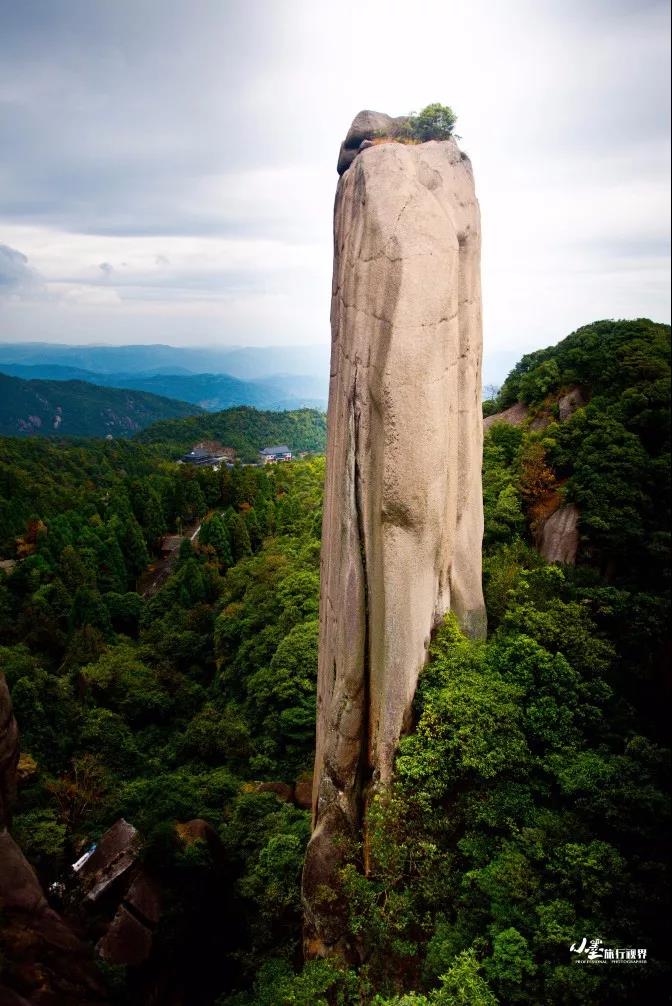 天柱峰为高约40m的石柱,横截面成椭圆形。顶部沿水平节里风华之二石蛋,大的一个像伏猫,小的一个像奔鼠,故称”金猫扑鼠“。晶洞花岗岩受昼夜温差变化,雨雾浸润产生热胀冷缩和湿胀干缩,岩石表面发生片状、砂状风化。崖壁和石蛋顶面由降雨汇聚的线状水流沿侧壁向下流淌侵蚀逐步形成——瀑布岩太姥山晶洞花岗岩沿纵向、横向和水平三组相互垂直的节理风化崩裂形成的岩块,经球状风化后成为浑圆的石蛋。太姥山的石蛋极为发育,散落于沟壑,堆叠于山巅,矗立于石堡、石柱之顶,千姿百态、形成惟妙惟肖的象形石。