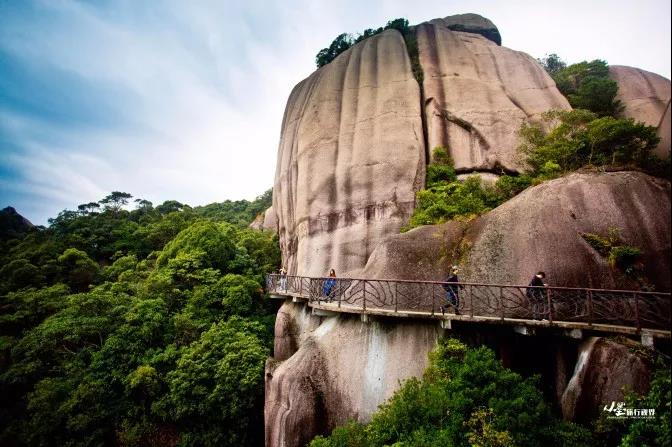 欣赏完湖,我们就要去登山了,让我们一起出发吧。去看一看太姥山的一些奇景。爬到一半,虽然已经汗流狭背,抬起头,望着遥不可及的山顶,心灵与精神受到了台阶的羞辱,但在旁边,有我中华的巍巍河山,以及奇景不亚于黄山的太姥山的山影,我又打起我那股劲继续攀登。在图片正中央的就是“猴子照镜”,看由于石头的形状怪异,他的“手”与它的“头”的动作配合的刚刚好,像是一只爱美的猴子拿着一面镜子在臭美呢。因它的形状如盘,故叫大盘石。站在这里,视野开阔,远近诸峰尽收眼底,在这里可以看到太姥山的三个时期,三种类型的花岗岩地貌。