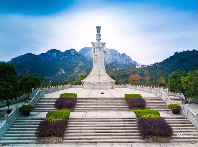 太姥娘娘雕像左边是乌龙岗,右边是虎头岗,前眺东海福瑶列岛,背靠摩霄峰。雕像由288块花岗岩组成,叠高18层,高20.88米,台阶的台数、级数,都暗合道教所推崇的数字“九”。雕像造型方中有圆,以方为主,吸收了北魏石窟雕像的秀骨清相的特点,揉进少许盛唐时代人物面部的丰润,同时又从汉俑中吸取单纯简洁之韵味。