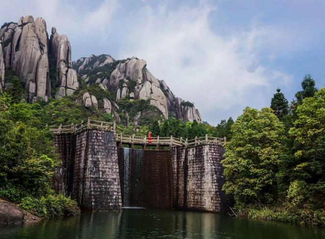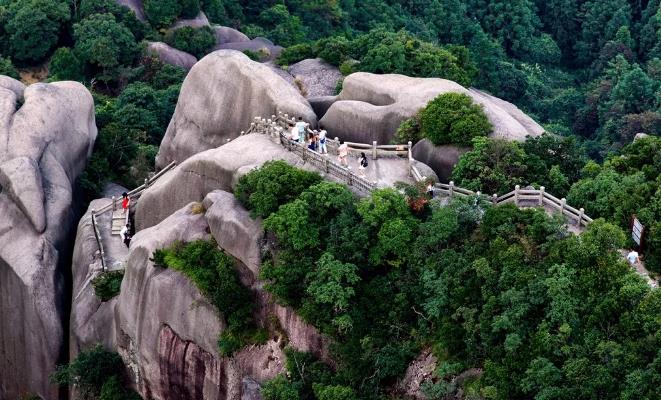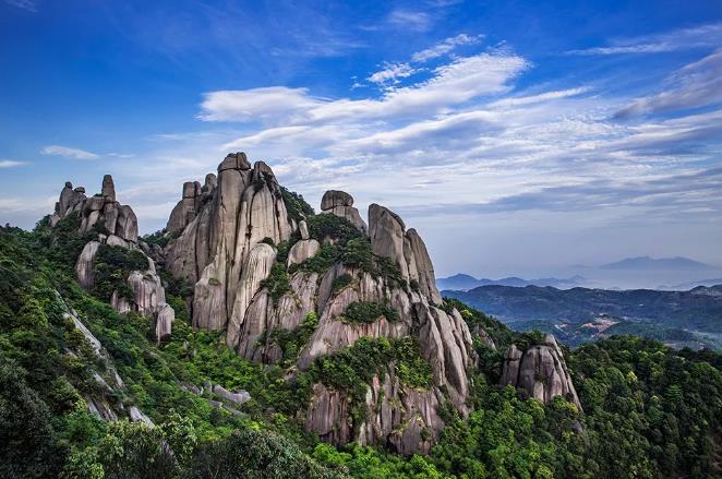 每一座山峰都高矗着巨大的花岗岩。每一块花岗岩都是一件雕塑艺术品。云蒸霞蔚的天空作衬布,杂花生树的山体作底座。由于天气变化,衬布和底座的色调瞬息万变,置于其间的花岗岩群雕,晨似美女暮似怪,横看如人侧如剑,变纪无穷,多彩多姿。大自然这位天才的雕塑大师,也许是现代派雕塑艺术的鼻祖。它不重具象重抽象,不重写实重写意,不重形似重神似。每一块石头都是多解或无解的谜,为欣赏主体提供了再想象再创作的广阔窨。“太姥无俗石,个个似神工。随人意所识,万象在胸中。”前人这首五绝,为太姥群雕作了最好的诠释。