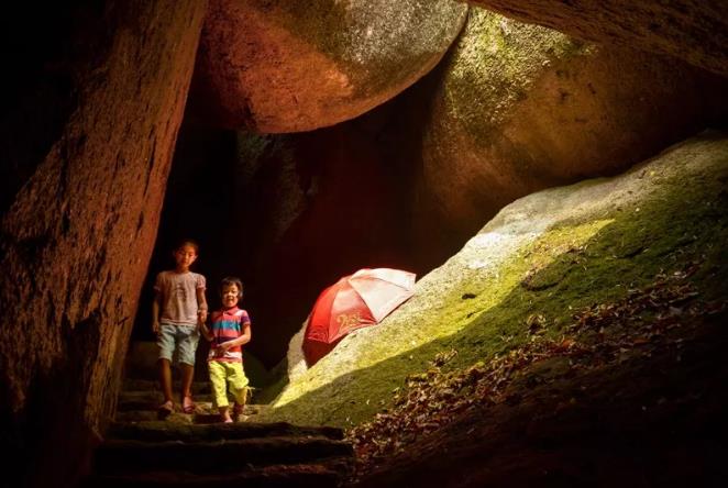 太姥山已探明最长的岸洞达十余里,需钻八个小时。但怕迷途难返,涉足者鲜。我们钻过最长的洞是将军洞。长二华里,几乎不停不歇地钻了一个半小时。此洞常有高不及人处,只能届膝弯腰而“钻”,像高甲戏中的丑角走“矮子步”;更有几段险处,洞大似箩,漆黑如夜,点上蜡烛,全身卧地,蛇行而过。虽千险万难,却如庭院。洞内巨石累累,有大象饮水,有壁虎戏檐,有骆驼负重……无不栩栩如生,叹为观止。最令人扼腕者,是洞之中段,狭如深巷,在敷十米高的顶端,两块花岗石亲密相含,宛若一对情人丰盈的嘴唇亲吻着,吸吮着,俗名亲嘴峰。这个凝固了亿万年的长吻,证明聪明的造物主早已预见亚当的夏娃,将不顾一切地偷吃禁果,因而在这琅福地,也精心创造了一件如此富有人情味的雕塑小品。