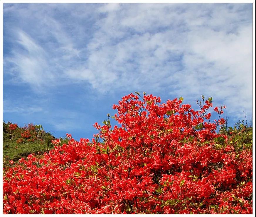 沿山脚往上走,只见杜鹃花铺满山冈,绵延十里不绝,覆盖了大小6个山头。大红杜鹃展示一片艳丽的中国红,似猎猎红旗招展,又如同天边飞来了火焰山。漫山遍野的红杜鹃“烈焰熊熊”接青天,映出满天的红霞,霞光四射。到了山顶回首俯瞰,连绵的杜鹃红波荡漾,峰灿红谷幽红,眼前顿然成了苍茫的红色花海。天坪杜鹃真可谓名副其实的映山红了。