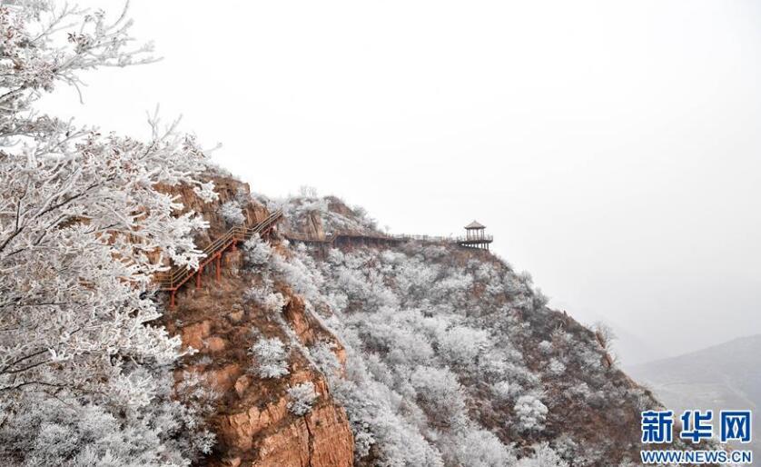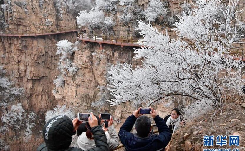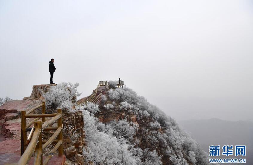1月23日,游人在河南鲁山阿婆寨景区观赏雾凇。当日,受大雾和强冷空气影响,河南省平顶山市鲁山县阿婆寨景区出现雾凇景观。 新华社记者 冯大鹏 摄