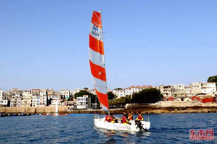 图为游客在铜陵镇南门湾畔渔人码头坐帆船领略海上风光。